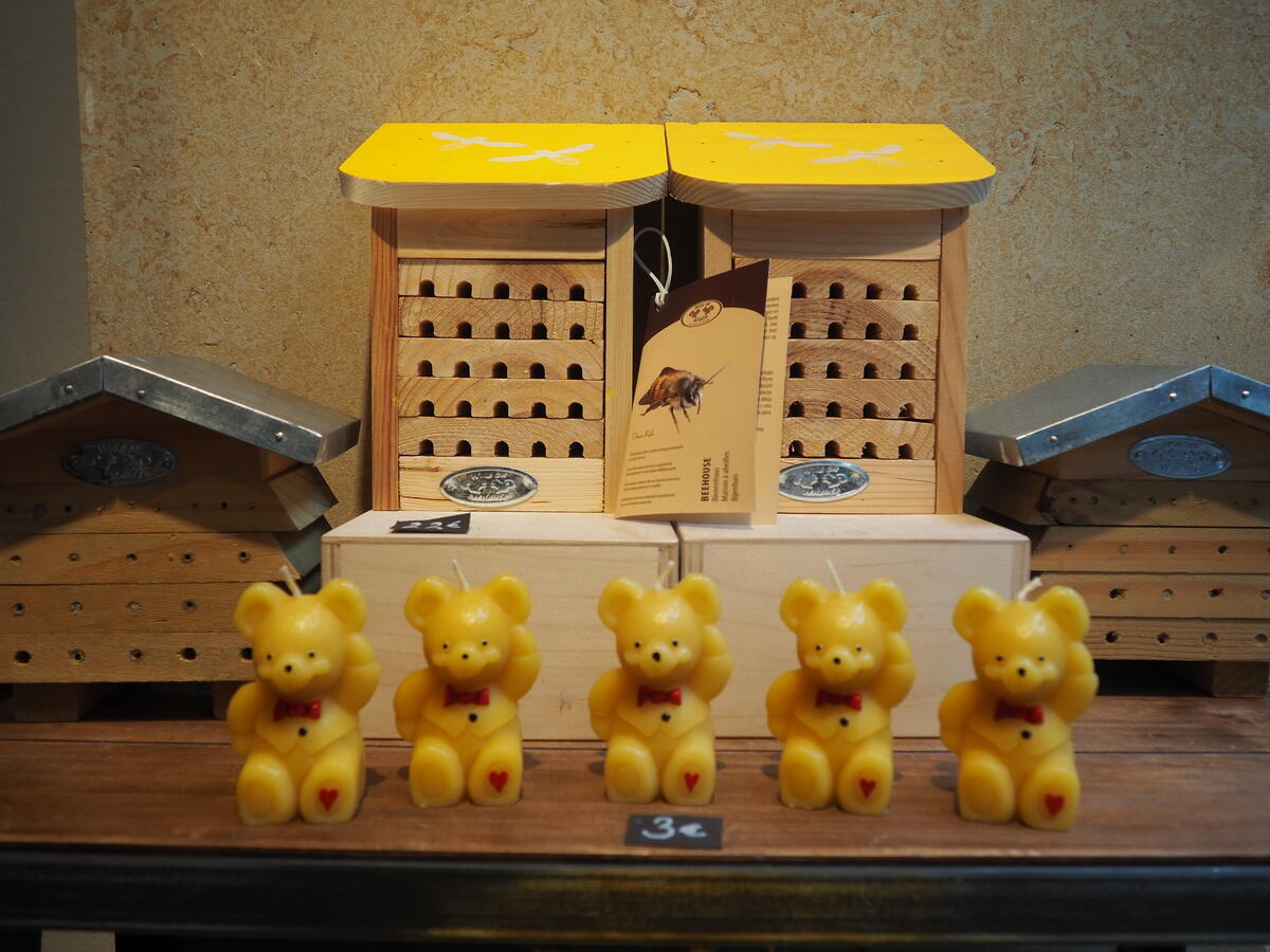 さまざまな蜜蝋キャンドルが並んでいます。