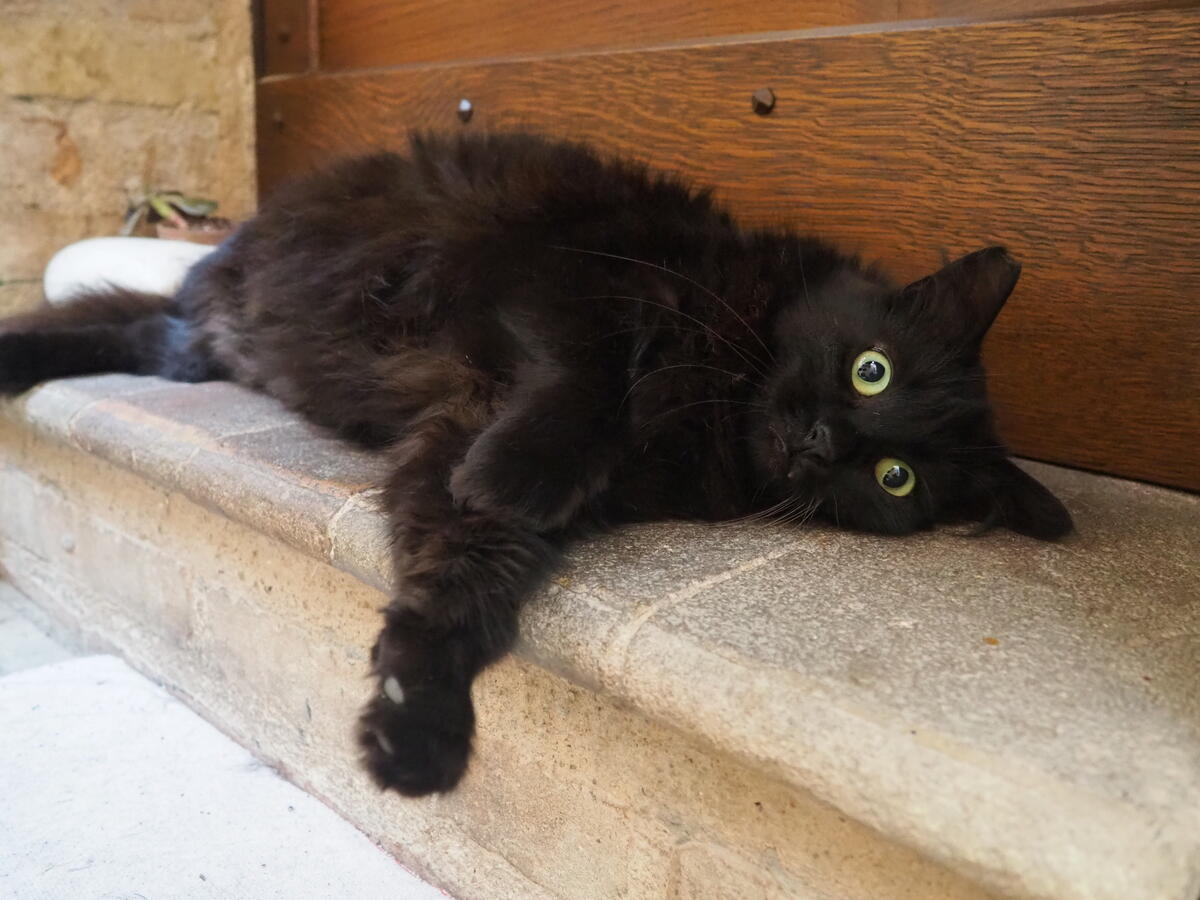 どこで撮影したのかストリート名が曖昧ですが、景色に溶け込む黒猫がとても美しく、印象に残っている路地。猫サイズの小さな階段もかわいらしいです。