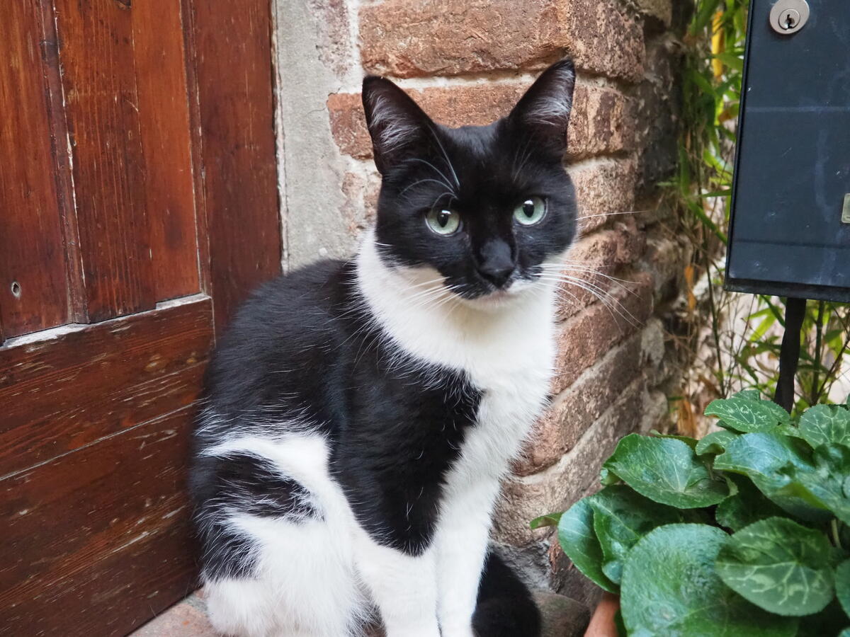 さっきの子と反対側の家の前には、大きなツタのアーチが印象的なお庭の前に、別のねこが寛いでいました。