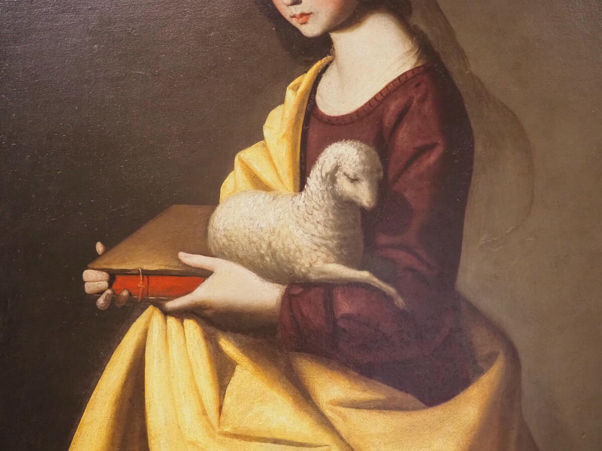 聖イネスの名前はラテン語で子羊を意味するため、子羊を抱いた姿で描かれるようです。